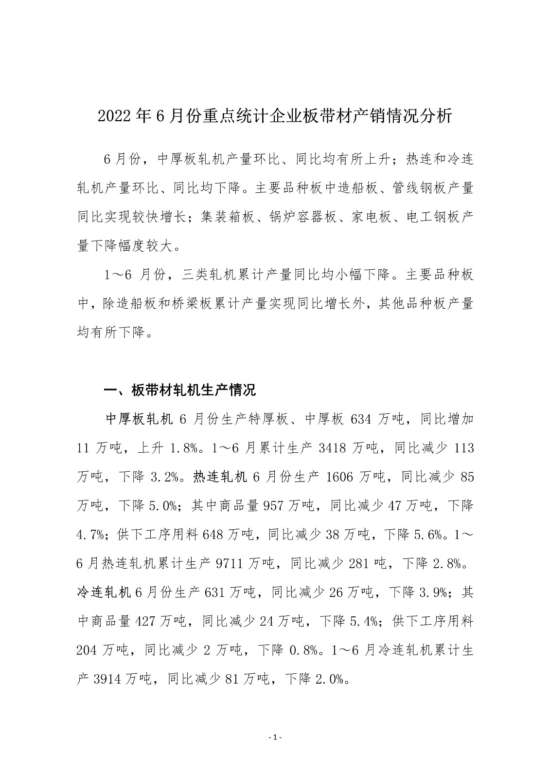 6月份,中厚板轧机产量环比、同比均有所上升;热连和冷连轧机产量环比、同比均下降。主要品种板中造船板、管线钢板产量同比实现较快增长;集装箱板、锅炉容器板、家电板、电工钢板产量下降幅度较大。1~6月份,三类轧机累计产量同比均小幅下降。主要品种板中,除造船板和桥梁板累计产量实现同比增长外,其他品种板产量均有所下降。