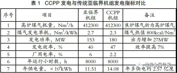 由表1可知,在同样的煤气量下,CCPP机组每年可比传统亚临界机组多发电2.57亿度,按电价0.5元/度计算,可折合为1.285亿元。同时,CCPP发电机组在自耗电量、自耗水量等方面也优于传统亚临界发电机组。