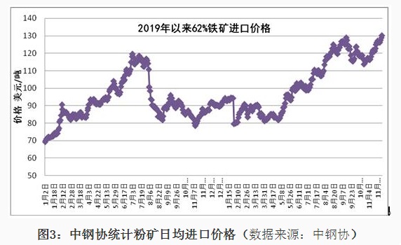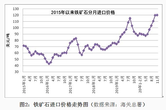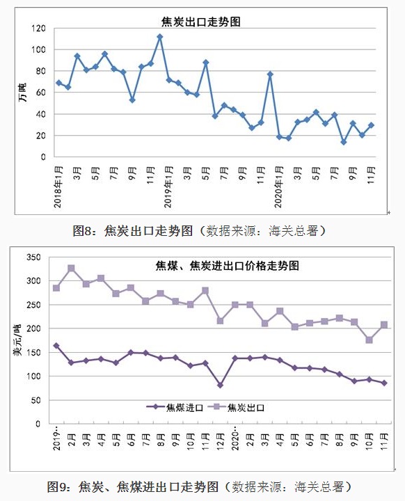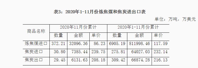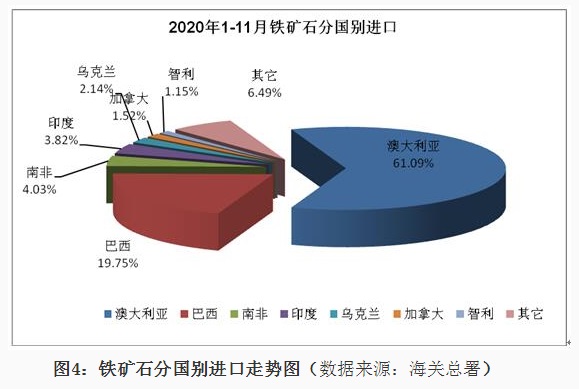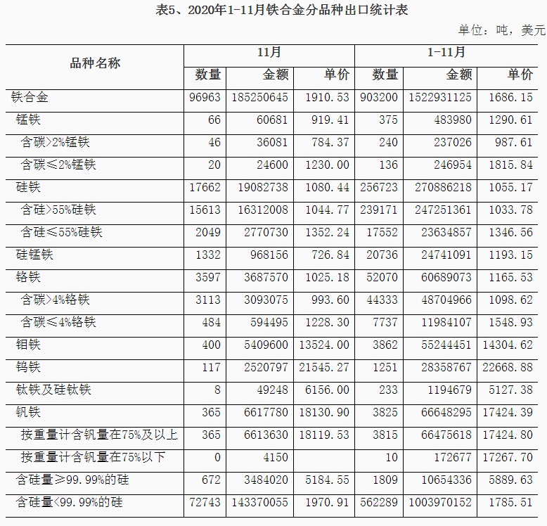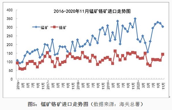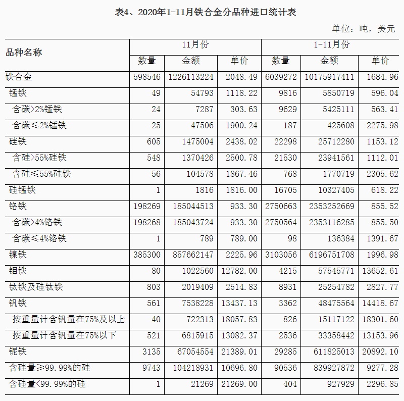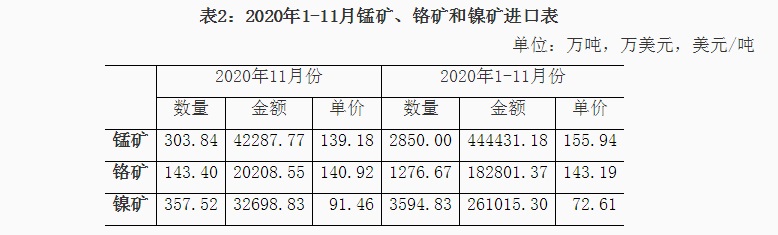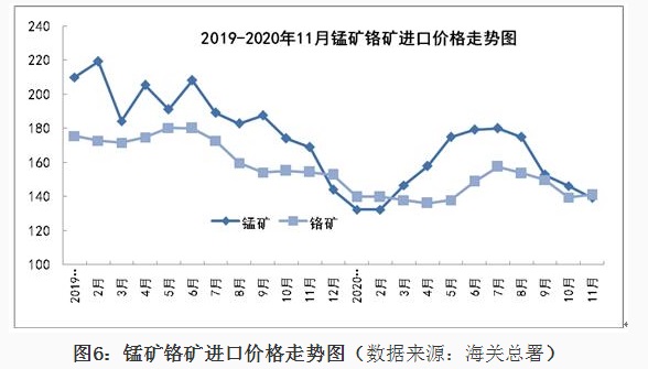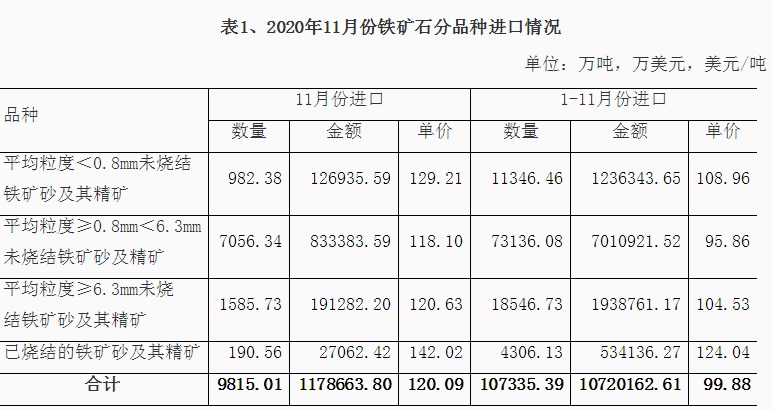 1、铁矿石进口情况 2020年11月我国铁矿石进口9815万吨,同比增长8.3%,进口金额同比增长44.5%,1-11月份铁矿石进口107335万吨,同比增长10.9%,进口金额同比增长16.2%。1-11月份进口铁矿石平均价格为99.88美元/吨;11月份进口平均价格为120.09美元/吨,与10月份比,仅增加0.28美元/吨,较去年同期增加29.44美元/吨,11月份进口澳大利亚铁矿价格为119.84美元/吨,较去年同期增加30.24美元/吨,进口巴西铁矿价格123.92美元/吨,较去年同期增加30.82美元/吨,进口南非铁矿价格124.9美元/吨,较去年同期增加24.43美元/吨,进口印度铁矿价格为96.67美元/吨。 从中钢协统计的62%粉矿每日进口价格看,1-11月份价格在80-129美元/吨之间波动,1月份价格在90-95美元/吨之间,春节后大幅下降至80美元/吨,持续一周后很快又上涨至90美元/吨,3月份铁矿石价格在83-90美元/吨波动,4月份波动幅度较小,在81-85美元/吨之间,5月份价格逐日攀升,到月底达到98.95美元/吨,6月份进口价格在98-103美元/吨之间,7月份再次上涨整体在100-110美元/吨之间运行,8月份价格继续上涨在110-125美元/吨的高位,9月上半月最高达到129美元/吨,下半月有所回落,10月份价格高位波动,11月份一直处于上涨态势,到月底价格达到了130美元/吨。 分国别进口情况 2020年1-11月铁矿石的主要进口国家是澳大利亚、巴西、南非、印度、乌克兰、加拿大、智利、秘鲁、俄罗斯联邦、毛里塔尼亚、蒙古和哈萨克斯坦,分别进口6.559亿吨、2.121亿吨、4332万吨、4104万吨、2298万吨、1632万吨、1236万吨、1230万吨、1212万吨、827万吨、777万吨和564万吨,从瑞典、马来西亚、伊朗、新西兰和缅甸的进口量在200万吨以上,从印度尼西亚、墨西哥和老挝进口在100万吨以上。从澳大利亚、巴西、南非、印度、乌克兰、加拿大进口所占的比例分别为61.09%、19.75%、4.03%、3.821%、2.14%和1.52%。 2、锰矿、铬矿和镍矿进口情况 2020年11月份锰矿进口303.84万吨,进口平均价格为139.18美元/吨,较上月下降7.06美元/吨,1-11月份进口锰矿2850万吨,进口平均价格在155.94美元/吨。 从分国别进口情况看,1-11月份锰矿从南非进口1203万吨,占进口量的42.2%,从澳大利亚进口485.8万吨,占进口量的17%,从加蓬、巴西、加纳、科特迪瓦、马来西亚、缅甸、哈萨克斯坦和赞比亚分别进口448万吨、259.6万吨、157.7万吨、107.1万吨、85.1万吨、49.7万吨、14.5万吨和12.2万吨。 2020年11月铬矿进口143.4万吨,进口平均价格为140.92美元/吨,1-11月份铬矿进口1277万吨,进口平均价格为143.19美元/吨。 从铬矿分国别进口情况看,1-11月份铬矿主要进口国家是南非、土耳其、津巴布韦、阿曼、巴基斯坦、阿尔巴尼亚、伊朗、巴西、巴布亚新几内亚和阿联酋,其中从南非进口1044万吨,占进口量的81.7%,从上述其它国家分别进56.5万吨、51.4万吨、32.1万吨、24.7万吨、20.1万吨、13.5万吨、11.7万吨、10万吨和5.9万吨。 2020年11月镍矿进口357.52万吨,较上月减少152.3万吨,进口平均价格为91.46美元/吨,较上月增加4.66美元/吨,1-11月份镍矿进口3595万吨,进口平均价格为72.61美元/吨。 2020年1-11月份镍矿的主要进口国家是菲律宾、印度尼西亚、新喀里多尼亚、澳大利亚、危地马拉、土耳其、俄罗斯联邦、南非和科特迪瓦,其中从菲律宾进口2951万吨,占进口量的82.1%,从上述其它国家分别进口332.3万吨、215.8万吨、23.7万吨、17.8万吨、15.2万吨、11.2万吨、10.4万吨和7.3万吨。 3、炼焦煤进口和焦炭进出口 2020年11月炼焦煤进口372.21万吨,较上月减少217.5万吨,进口金额为86.23美元/吨,较上月降低7.17美元/吨,1-11月份炼焦煤进口6905万吨,1-11月份进口平均价格在117.59美元/吨。从分国别进口情况看,1-11月份主要进口国家是澳大利亚、蒙古、俄罗斯联邦、加拿大、美国、印度尼西亚、哈萨克斯坦、莫桑比克和哥伦比亚,其中从澳大利亚进口3535万吨,占进口量的51.2%,从上述其它国家分别进口2221万吨、554.9万吨、415.5万吨、81.6万吨、62.2万吨、17.2万吨、7.7万吨和5.3万吨。 2020年11月焦炭出口29.45万吨,11月份出口平均价格为208.18美元/吨,1-11月份焦炭出口309.4万吨,1-11月份出口平均价格在216.13美元/吨。 从分国别和地区出口情况看,1-11月份主要出口国家和地区是印度尼西亚、马来西亚、印度、越南、日本、韩国、巴西、澳大利亚和中国台湾,分别出口75万吨、71.9万吨、33.8万吨、23.5万吨、19.4万吨、17.8万吨、16.2万吨、11.9万吨和9.2万吨,出口伊朗、哈萨克斯坦和荷兰的数量在3万吨以上。 2020年11月份焦炭进口30.8万吨,11月份进口平均价格为239.75美元/吨,1-11月份焦炭进口275.8万吨,进口平均价格为231.14美元/吨。 1-11月份进口主要来自日本、波兰、澳大利亚、俄罗斯联邦、哥伦比亚、韩国、中国台湾和智利,分别进口113.9万吨、52万吨、37.1万吨、21.5万吨、16万吨、13.7万吨、8.7万吨和7.4万吨。 4、铁合金分品种进出口情况 2020年11月铁合金进口59.85万吨,1-11月份铁合金进口603.9万吨,铁合金进口的主要品种是C>4%铬铁、镍铁、含硅量≥99.99%的硅,分别进口275.1万吨、310.3万吨和9.1万吨。 2020年11月份铁合金出口9.7万吨,1-11月份铁合金出口90.3万吨,其中硅铁出口25.7万吨,含硅量<99.99%的金属硅出口56.2万吨。 2020年1-11月份含碳量>4%铬铁的主要进口国家是南非、哈萨克斯坦、印度、津巴布韦和芬兰,从南非进口146.5万吨,占铬铁进口量的53.3%,从上述其它国家分别进口78.1万吨、31.2万吨、9.7万吨和6万吨。2020年1-11月
