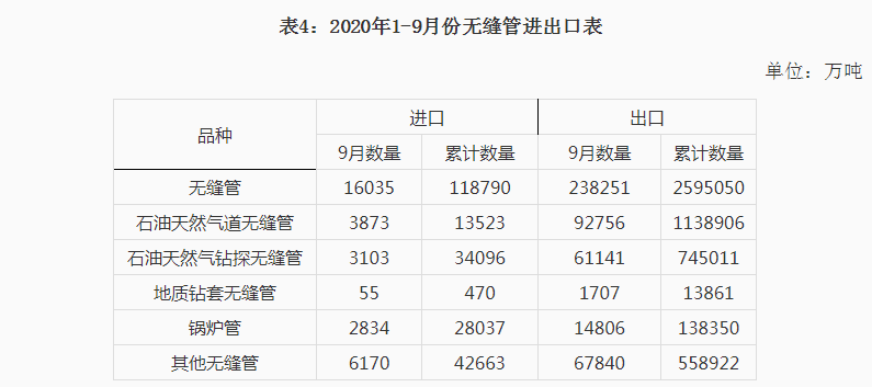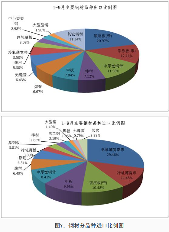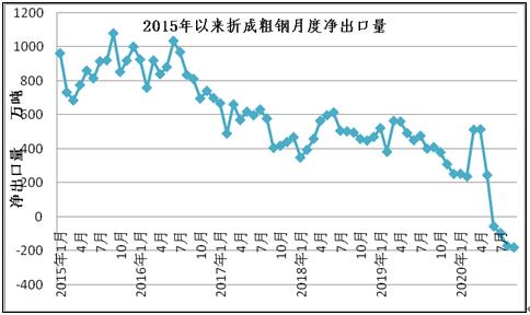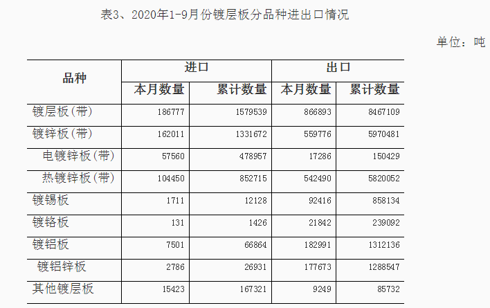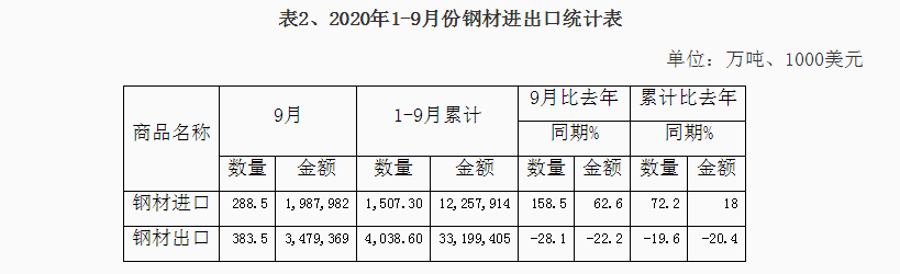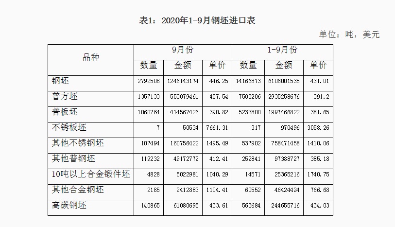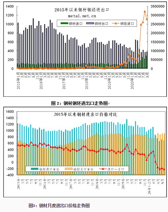 2020年1-9月份钢材、钢坯进出口走势 9月份中国进口钢坯279.3万吨仍处高位,钢材进口288.5万吨,较上月增加64.4万吨,6-9月份连续四个月我国为粗钢净进口,并且净进口量逐月增加。 图1:折成粗钢月度净出口 一、钢材、钢坯进出口情况 1、钢坯进口情况 2020年9月进口钢坯279.3万吨,进口平均价格为446.3美元/吨,较上月增加36.5美元/吨,1-9月份钢坯进口1416.7万吨,同比增长932%,进口平均价格为431美元/吨,其中普方坯和普板坯分别进口750.3万吨和523.4万吨。1-9月份钢坯出口1.48万吨。 2020年1-9月份普方坯进口主要来自印度、俄罗斯联邦、越南、伊朗、马来西亚、乌克兰、印度尼西亚、阿曼、日本、哈萨克斯坦、韩国、阿联酋和巴西,分别进口202.8万吨、127.3万吨、102.5万吨、81.6万吨、74.8万吨、39.3万吨、35万吨、26万吨、16.8万吨、12万吨、9.4万吨、8.1万吨和7.7万吨。 2020年1-9月份普板坯进口主要来自俄罗斯联邦、巴西、越南、阿联酋、印度、印度尼西亚、日本、伊朗、墨西哥、韩国、乌克兰、沙特阿拉伯、哈萨克斯坦和阿曼,分别进口141.1万吨、91.2万吨、59万吨、35.4万吨、34.7万吨、33万吨、31.2万吨、26.7万吨、23.1万吨、14.7万吨、8.7万吨、7.7万吨、6.9万吨和5.5万吨。 2、钢材进出口情况 2020年9月钢材出口383.5万吨,同比降低28.1%,出口金额同比降低22.2%,1-9月份钢材出口4038.6万吨,同比降低19.6%,出口金额同比降低20.4%;9月份进口钢材288.4万吨,同比增长158.5%,进口金额同比增长62.6%,1-9月份进口钢材1507.3万吨,同比增长72.2%,进口金额同比增长18%。 9月份钢材进口保持高位,9月份钢材净出口94万吨,9月份进口钢坯279.3万吨,进口钢锭4345吨,出口钢坯钢锭779吨,折成粗钢9月份净进口179.5万吨,较上月的净进口增加10万吨,6-9月份粗钢净进口量连续四个月不断增加。 1-9月份钢材净出口2531.3万吨,钢坯进口1416.7万吨,钢锭进口5.1万吨,钢坯、钢锭出口1.6万吨,1-9月份折合成粗钢净出口1263万吨。 从贸易额看,1-9月份钢材进口贸易额122.6亿美元,出口贸易额332亿美元,进出口贸易总额顺差209.4亿美元。9月份进口单价为688.1美元/吨,较上月降低20.2美元/吨,与去年同期相比降低412美元/吨,出口单价为907.3美元/吨, 9月份出口单价再次超过进口单价218.2美元/吨。 图3:钢材月度进出口价格走势图 按贸易方式分,1-9月份出口钢材中一般贸易出口3874万吨,占出口量的95.9%,1-9月份进口钢材中一般贸易进口1262.2万吨,占钢材进口量的83.7%,进料加工贸易进口157.8万吨,占进口量的10.5%。 分国家/地区进出口 从分国家/地区进口情况看,9月份主要进口国家和地区是韩国、日本、中国台湾、印度、马来西亚、越南、乌克兰、印度尼西亚和俄罗斯联邦,分别进口56.2万吨,53.5万吨、39.6万吨、36.6万吨、25.4万吨、14.5万吨、11万吨、10万吨和8.1万吨,从上述国家/地区进口占9月份进口量的88.4%。其中从印度进口平均价格为449.6美元/吨,马来西亚进口平均价格为430.8美元/吨,乌克兰进口平均价格为398.7美元/吨,俄罗斯进口平均价格为408.2美元/吨,从这些国家进口的钢材大幅拉低了进口平均价格。 1-9月份钢材主要进口自韩国、日本、印度、中国台湾、马来西亚、印度尼西亚、德国、俄罗斯联邦、哈萨克斯坦、越南、乌克兰、瑞典和荷兰,分别进口390.8万吨、359.1万吨、170万吨、150.6万吨、136.9万吨、60.8万吨、39.9万吨、28.1万吨、27.6万吨、24.7万吨、23.9万吨、12.8万吨和11.9万吨,进口中国产钢材10.9万吨。2019年1-9月份从日本、韩国、中国台湾进口占进口量的83.8%,今年1-9月份从日本、韩国和中国台湾进口仅占进口量的59.7%,而从印度、马来西亚和印尼的进口分别占到了11.28%、9.1%和4.2%。 图4:钢材分国别进口对比 从分地区钢材出口情况看,1-9月份出口亚洲2777万吨,占出口量的68.8%,出口非洲471万吨,占出口量的11.7%,出口欧盟175万吨,占出口量4.3%,出口南美秘鲁、智利和巴西三个国家的数量为203万吨,占出口量的5%,出口美国、墨西哥和加拿大三个北美国家的数量在106万吨,占出口量的2.6%。 从具体的分国家/地区出口情况看,1-9月份出口量比较大的国家是韩国、越南、泰国、菲律宾、印度尼西亚缅甸、沙特阿拉伯和阿拉伯联合酋长国,分别出口了437.8万吨、330.6万吨、298.8万吨、224.3万吨、155.5万吨、133.1万吨、126.5万吨和108.9万吨。 1-9月份出口量在70万吨以上的国家和地区有巴基斯坦、印度、马来西亚、中国香港、秘鲁和智利,出口尼日利亚、日本、中国台湾、新加坡、巴西、孟加拉国、美国、美国、俄罗斯联邦和土耳其的数量在50万吨以上,出口意大利、加纳、埃及、澳大利亚、哥伦比亚、肯尼亚、乌兹别克斯坦、南非和科威特的数量在30万吨以上,出口蒙古、墨西哥、伊朗、西班牙、加拿大、加拿大、伊拉克、厄瓜多尔、坦桑尼亚、乌克兰、比利时、阿曼、吉布提、以色列和危地马拉的数量在20万吨以上,出口斯里兰卡、阿尔及利亚、洪都拉斯、卡塔尔、苏丹、老挝、科特迪瓦共和国、哈萨克斯坦、荷兰、哥斯达黎加、安哥拉、柬埔寨、也门共和国、德国、多米尼加共和国、莫桑比克、摩洛哥和几内亚的数量在10万吨以上。 钢材分品种进出口 从钢材分大类品种的出口看,1-9月份板材出口2446万吨,占钢材出口量的60.6%,管材和棒线材出口分别出口562.4万吨和534.7万吨,分别占钢材出口量的13.9%和13.2%,角型钢出口197.3万吨,占钢材出口量的4.9%。 1-9月份